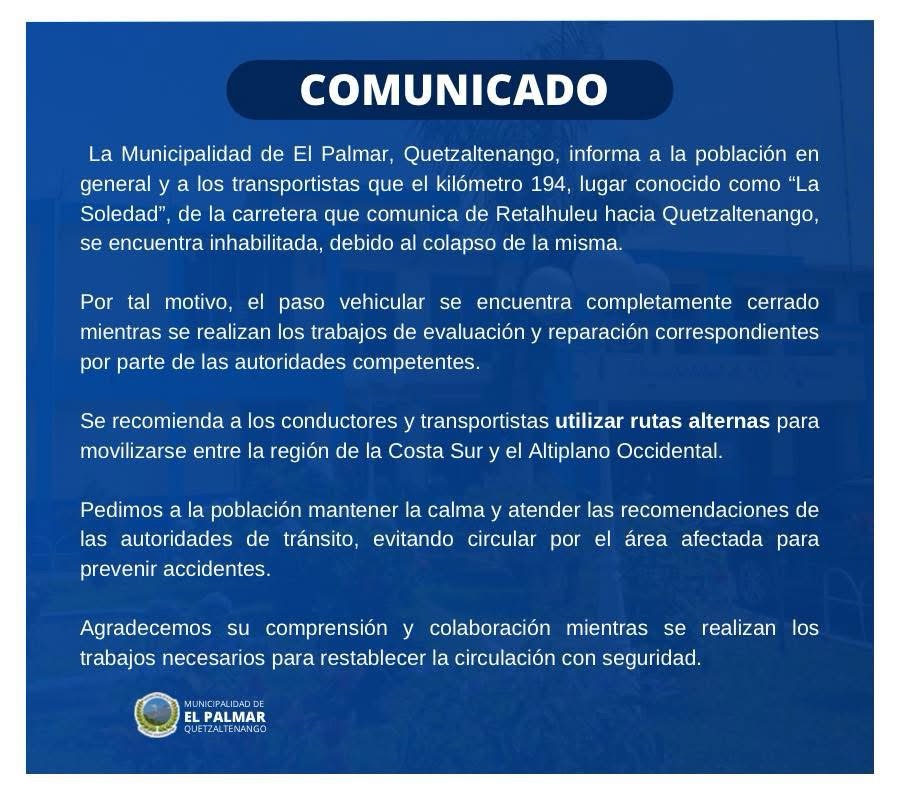 La Municipalidad de El Palmar, Quetzaltenango, informó que la carretera que comunica de Retalhuleu hacia Quetzaltenango, a la altura del kilómetro 194, en el sector conocido como “La Soledad”, se encuentra completamente inhabilitada debido al colapso de una parte de la vía.
