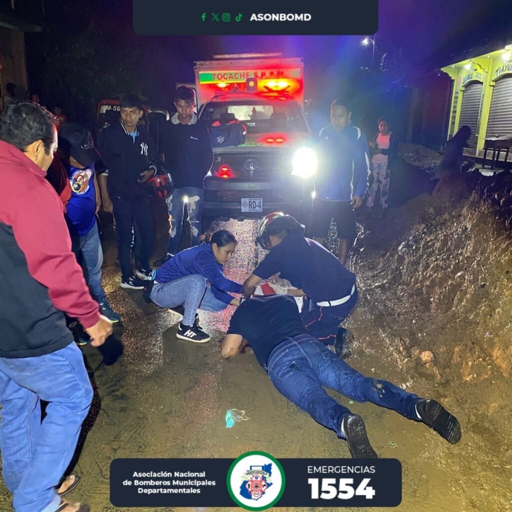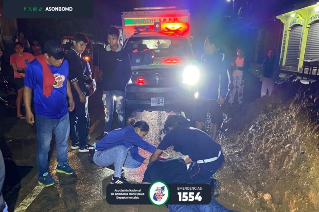 El incidente se produjo por causas aún no determinadas e involucró la colisión de dos motocicletas. Los socorristas brindaron atención prehospitalaria a Yonger Alvarado, de 33 años, originario del caserío Nuevo Egipto, Malacatán, quien sufrió laceraciones en varias partes del cuerpo y una herida contundente en la parte frontal del cráneo.