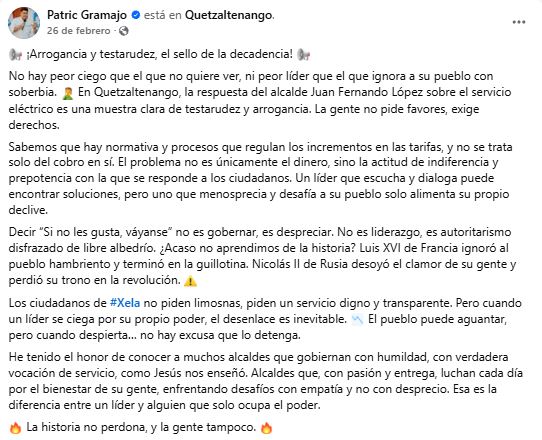 «En Quetzaltenango, la respuesta del alcalde Juan Fernando López sobre el servicio eléctrico es una muestra clara de testarudez y arrogancia. La gente no pide favores, exige derechos. El problema no es únicamente el dinero, sino la actitud de indiferencia y prepotencia con la que se responde a los ciudadanos», escribió Gramajo.