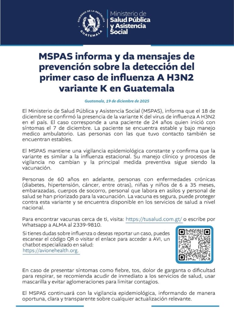 El Ministerio de Salud Pública y Asistencia Social confirmó la detección del primer caso de influenza A H3N2 variante K en Guatemala y emitió una serie de mensajes de prevención dirigidos a la población, con el objetivo de reducir el riesgo de contagio y evitar la propagación del virus.
