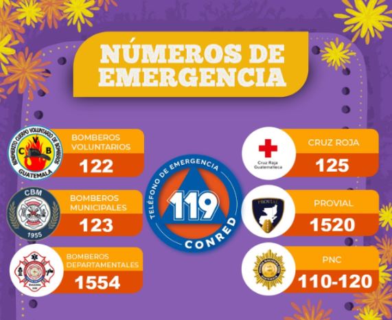 - En caso de emergencias pueden llamar a los siguientes números: 119 de Conred, 110 y 120 de PNC, 122 de Bomberos Voluntarios, 123 de Bomberos Municipales, 125 de Cruz Roja Guatemalteca y 150 de Provial.
