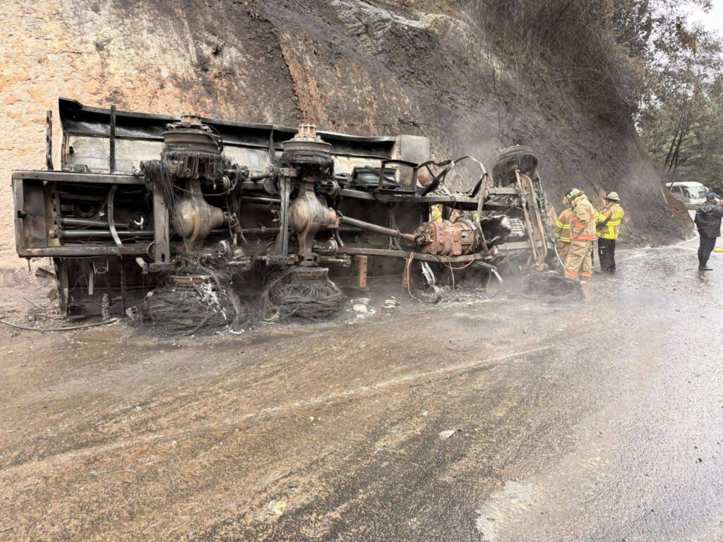 En seguimiento a la emergencia por materiales peligrosos, el Sistema Conred continúa las acciones de respuesta tras el incendio de una pipa de combustible, este miércoles, en el kilómetro 102 de la ruta CA-01 Occidente, sector Agua Escondida, Chichicastenango, El Quiché.