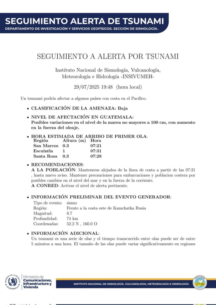 El Sistema CONRED a través del INSIVUMEH, informa sobre una alerta de tsunami. El evento generador fue registrado frente a la costa Este de Kamchatsky, Rusia. Como parte del monitoreo regional, se ha determinado que este fenómeno podría generar efectos en varios países con costa en el Pacífico, incluyendo a Guatemala.