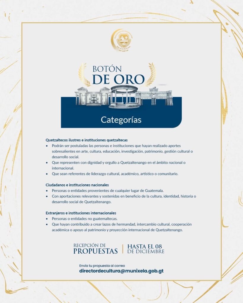 La Municipalidad de Quetzaltenango está aceptando candidaturas para los prestigiosos reconocimientos «Botón de Oro» y «Chivo de Oro» 2025, otorgados por la Casa de la Cultura de Occidente. Estos galardones tienen como objetivo reconocer y honrar a personas y entidades que han contribuido significativamente al desarrollo cultural, artístico, social y deportivo de la región.