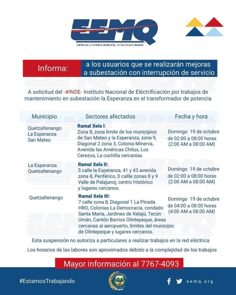 La Empresa Eléctrica Municipal de Quetzaltenango (EEMQ) informó que este domingo 19 de octubre se realizará un corte programado de energía eléctrica, a solicitud del Instituto Nacional de Electrificación (INDE).