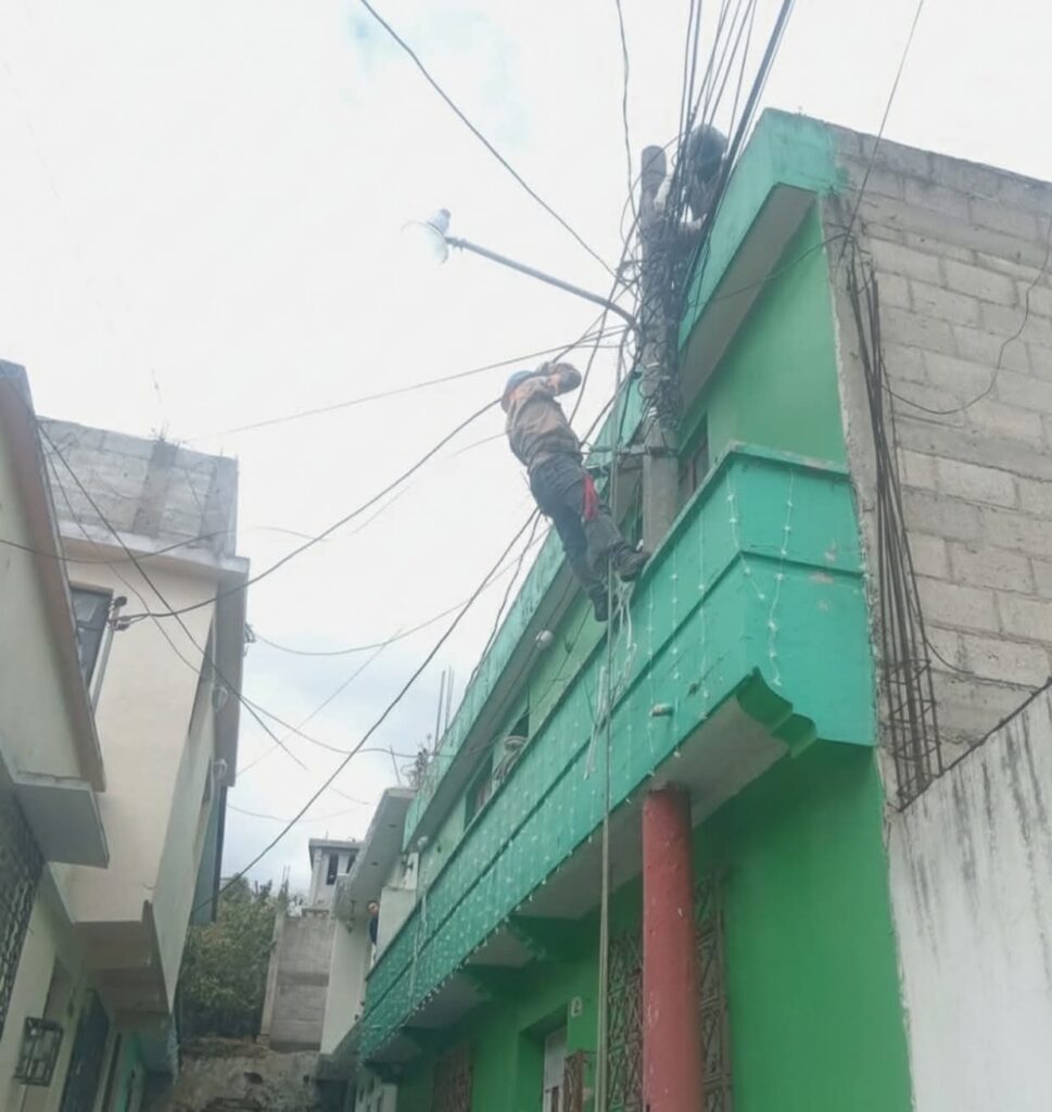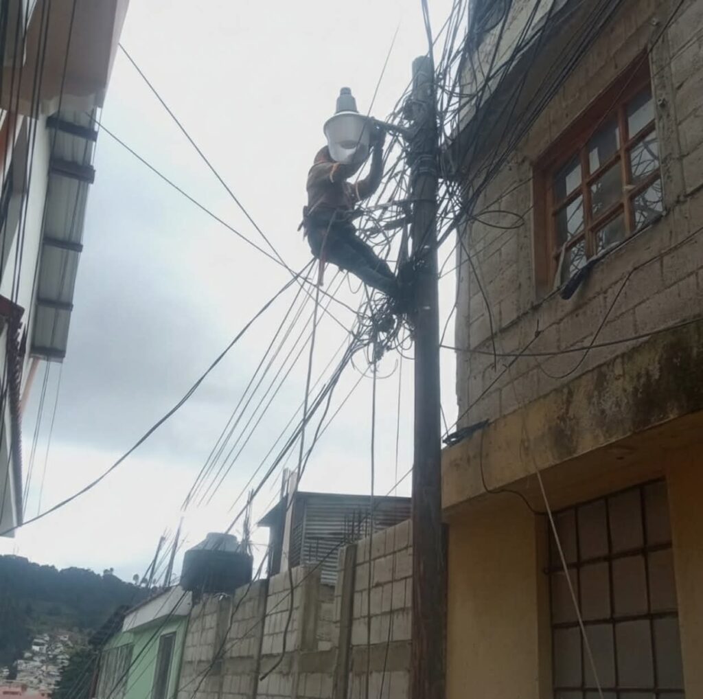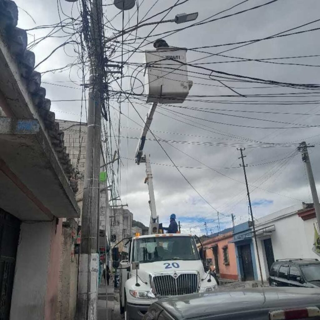 Técnicos del área de Alumbrado Público de la Empresa Eléctrica Municipal de Quetzaltenango (EEMQ) desarrollan trabajos como parte del programa de iluminación urbana en varias zonas de la ciudad, con el objetivo de mejorar las condiciones de visibilidad y seguridad para peatones y conductores.