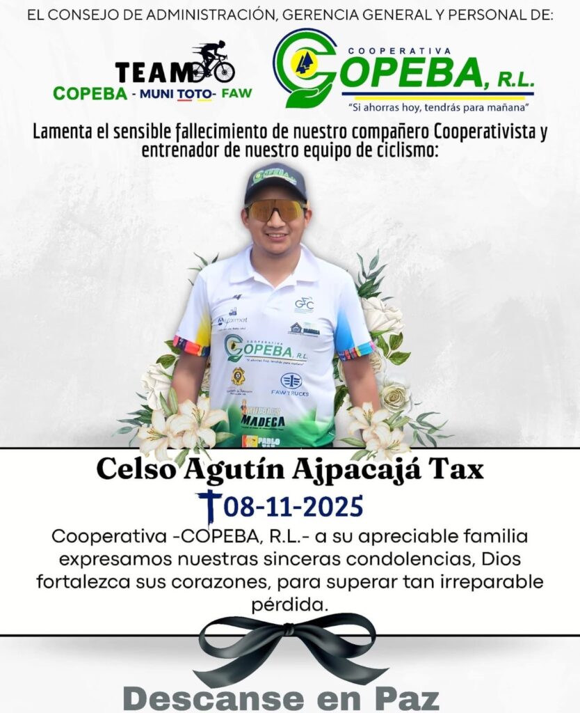 “Como familia COPEBA, R.L., lamentamos el sensible fallecimiento de nuestro compañero y entrenador de nuestro equipo de ciclismo TEAM COPEBA MUNI-TOTO FAW: Celso Agustín Ajpacajá Tax”.