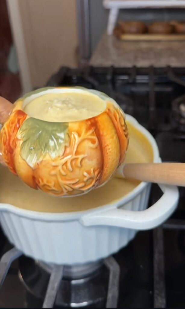 Disolvemos el puré de calabaza con la taza de agua, y esta mezcla la vertemos en la olla sin dejar de mover.