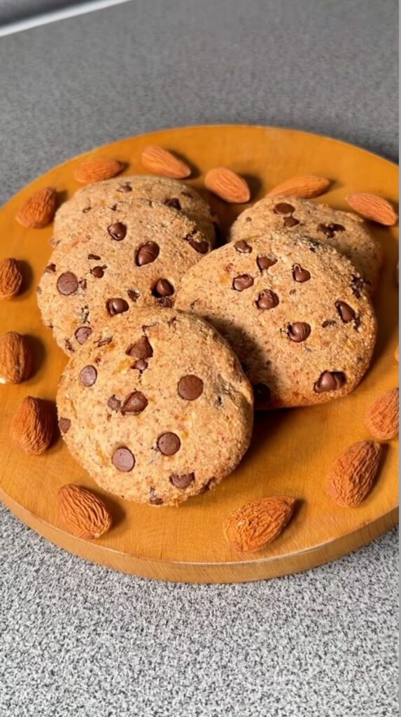 Hacer puré el banano con ayuda de un tenedor agregar las almendras molidas y mezclar hasta integrar. Agregar las chispas de chocolate y combinar.