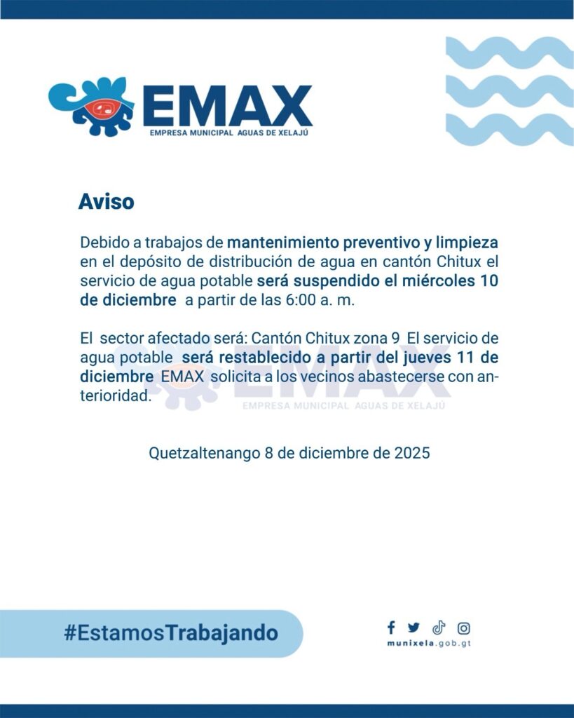 La Empresa Municipal Aguas de Xelajú (EMAX) informó que el próximo miércoles 10 de diciembre se suspenderá el servicio de agua potable en el cantón Chitux, zona 9 de Quetzaltenango, debido a trabajos de mantenimiento preventivo y limpieza en el depósito de distribución de agua del sector.