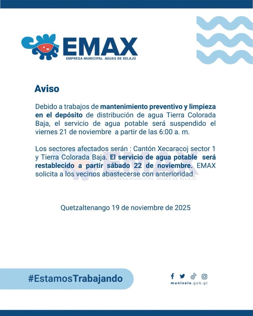 La Empresa Municipal Aguas de Xelajú (EMAX) informó que el viernes 21 de noviembre se llevará a cabo una jornada de mantenimiento preventivo y limpieza en el depósito de distribución de agua ubicado en Tierra Colorada Baja, como parte de las acciones destinadas a garantizar la calidad del servicio y el adecuado funcionamiento de la infraestructura hídrica municipal.