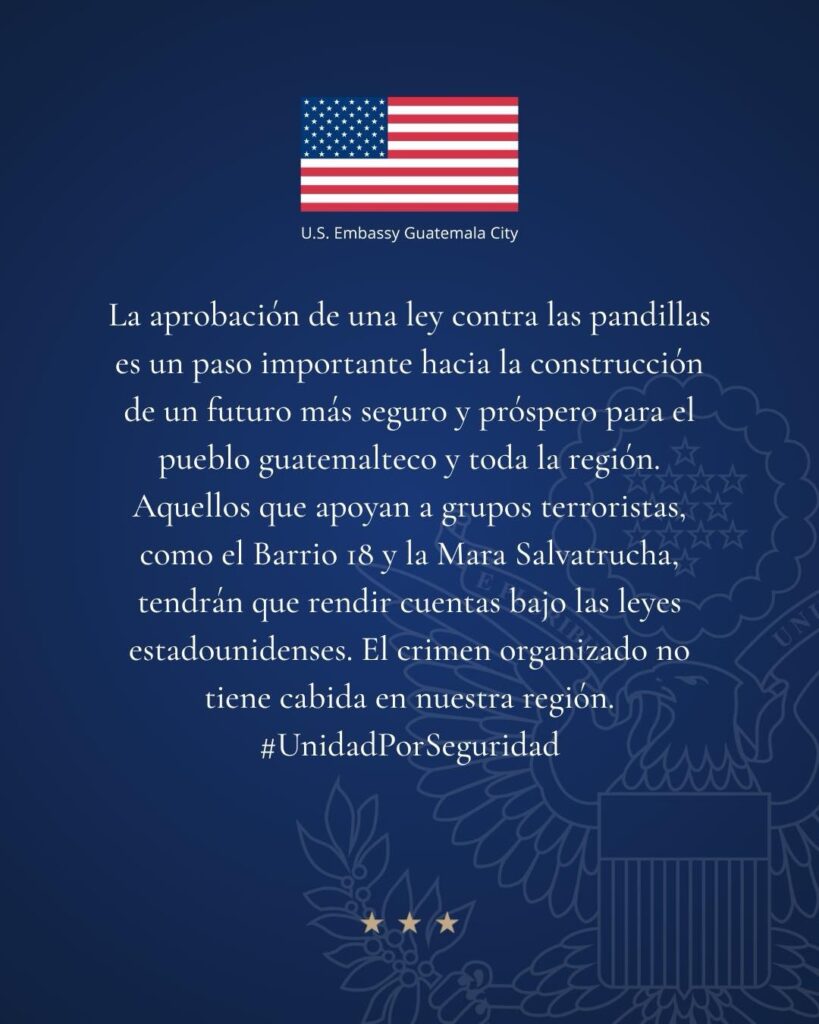 La Embajada de Estados Unidos en Guatemala se pronunció tras la reciente aprobación de la Ley para el Combate Frontal a las Actividades Delictivas de las Maras, también conocida como Ley Antipandillas, por parte del Congreso de la República.