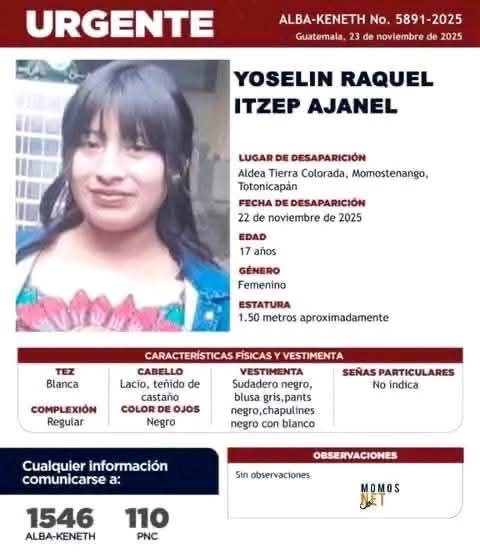 De manera preliminar, fuentes oficiales confirmaron que la víctima es Yoselin Raquel Itzep Ajanel, de 17 años, quien había desaparecido el 22 de noviembre de 2025 en la aldea Tierra Colorada, Momostenango, Totonicapán.