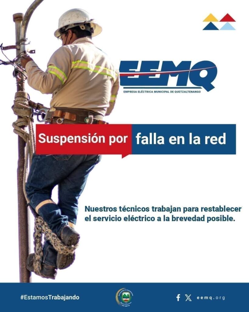 Personal de la Empresa Eléctrica Municipal de Quetzaltenango (EEMQ) se encuentra trabajando en la zona para restablecer el servicio, realizando maniobras de reparación y evaluación del sistema afectado.