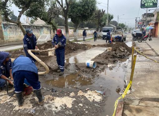 Este lunes, personal de la Empresa Municipal de Aguas de Xelajú (EMAX) trabaja en la 4ª calle y 21 avenida, zona 1 de Quetzaltenango, sector del Calvario, donde se registra una fuga en red de distribución de agua potable.