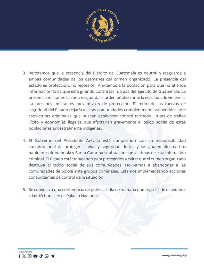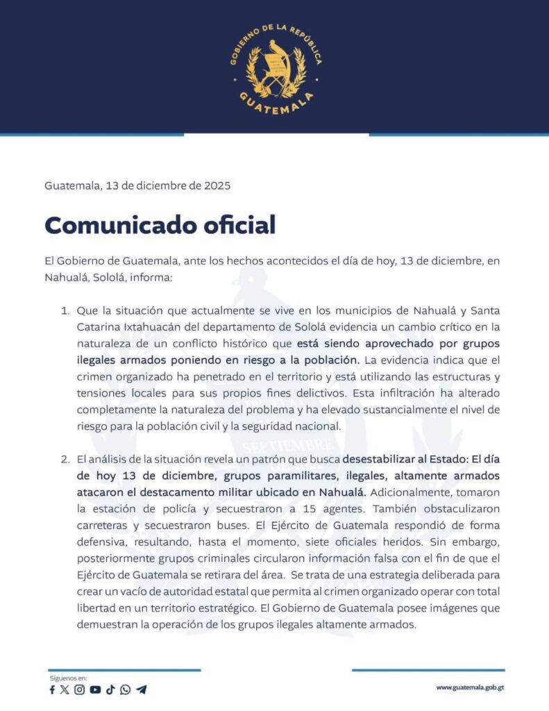 El pronunciamiento detalla que este viernes 13 de diciembre, grupos armados ilegales atacaron el destacamento militar en Nahualá, tomaron la estación de la Policía Nacional Civil, retuvieron a 15 agentes, bloquearon carreteras y secuestraron autobuses. Ante estos hechos, el Ejército de Guatemala respondió de forma defensiva, resultando siete oficiales heridos, de acuerdo con información preliminar.