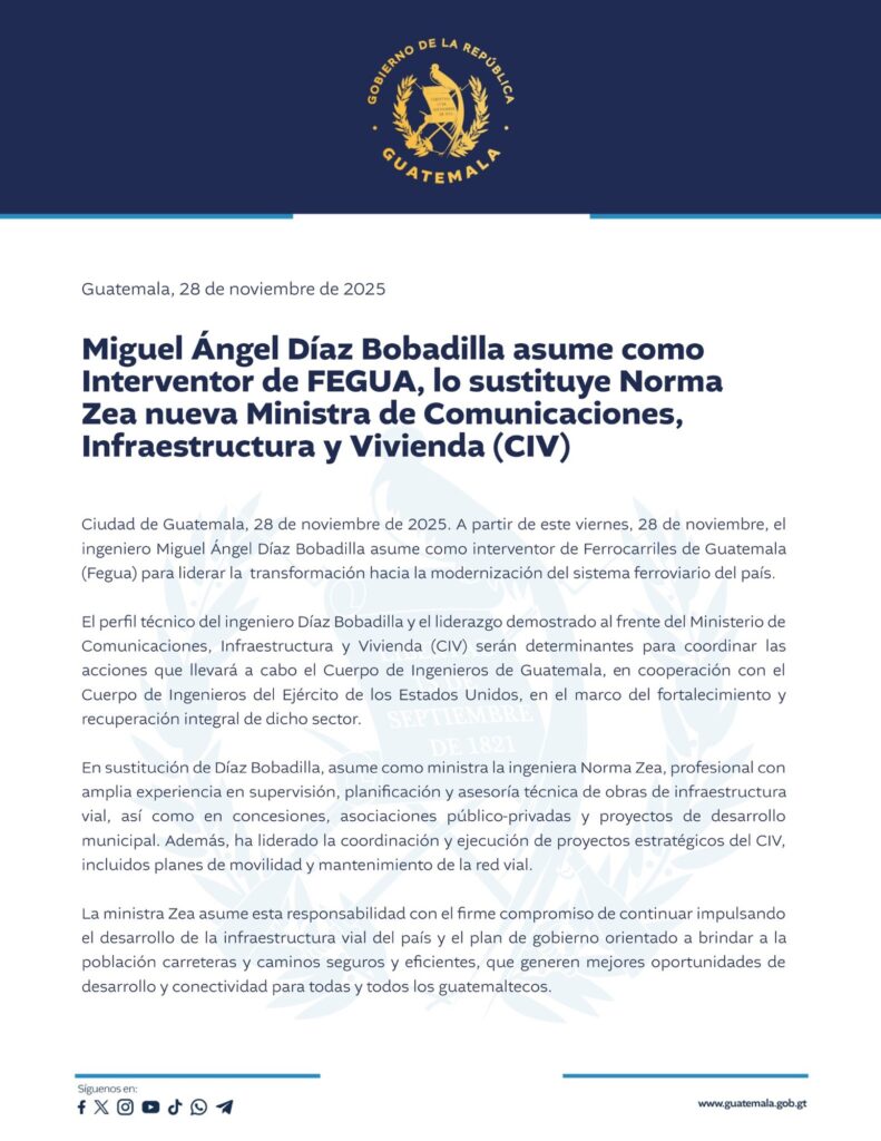 El Gobierno de Guatemala confirmó este viernes 28 de noviembre un reacomodo clave en el sector de la infraestructura nacional: el ingeniero Miguel Ángel Díaz Bobadilla deja la titularidad del Ministerio de Comunicaciones, Infraestructura y Vivienda (CIV) para asumir como interventor del Ferrocarriles de Guatemala (FEGUA), mientras que la ingeniera civil Norma Zea Osorio fue nombrada como nueva ministra del CIV.