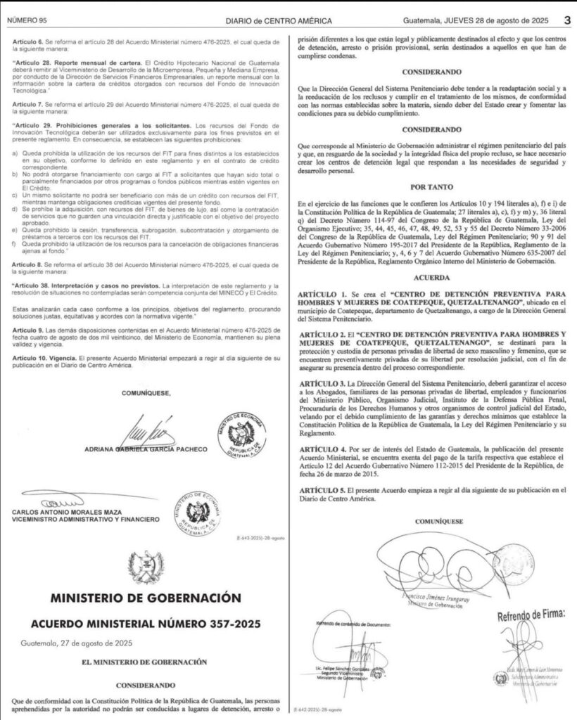 El Ministerio de Gobernación (Mingob) oficializó la creación del Centro de Detención Preventiva para hombres y mujeres en Coatepeque, Quetzaltenango, según consta en el Acuerdo Ministerial 357-2025, publicado este jueves en el Diario de Centro América.