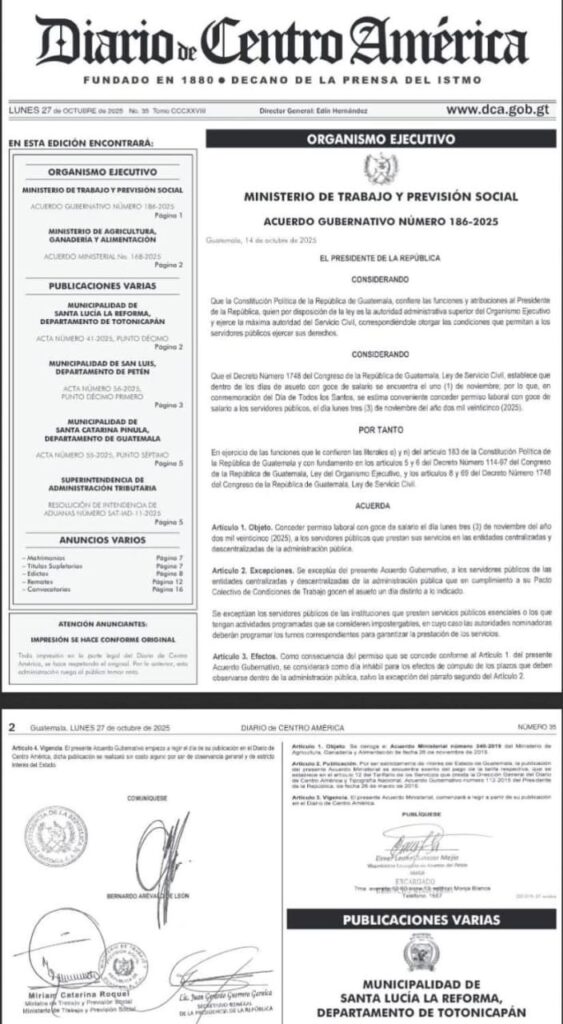 El Acuerdo Gubernativo 186-2025, publicado en el Diario Oficial, establece un permiso laboral con goce de salario para el lunes 3 de noviembre de 2025, con motivo de la conmemoración del Día de Todos los Santos.