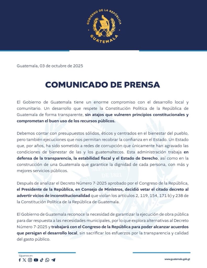 El Gobierno de Guatemala anunció el veto (no aprobación) al Decreto 7-2025, Ley de Fortalecimiento Financiero y Continuidad de Proyectos de Consejos de Desarrollo Urbano y Rural.