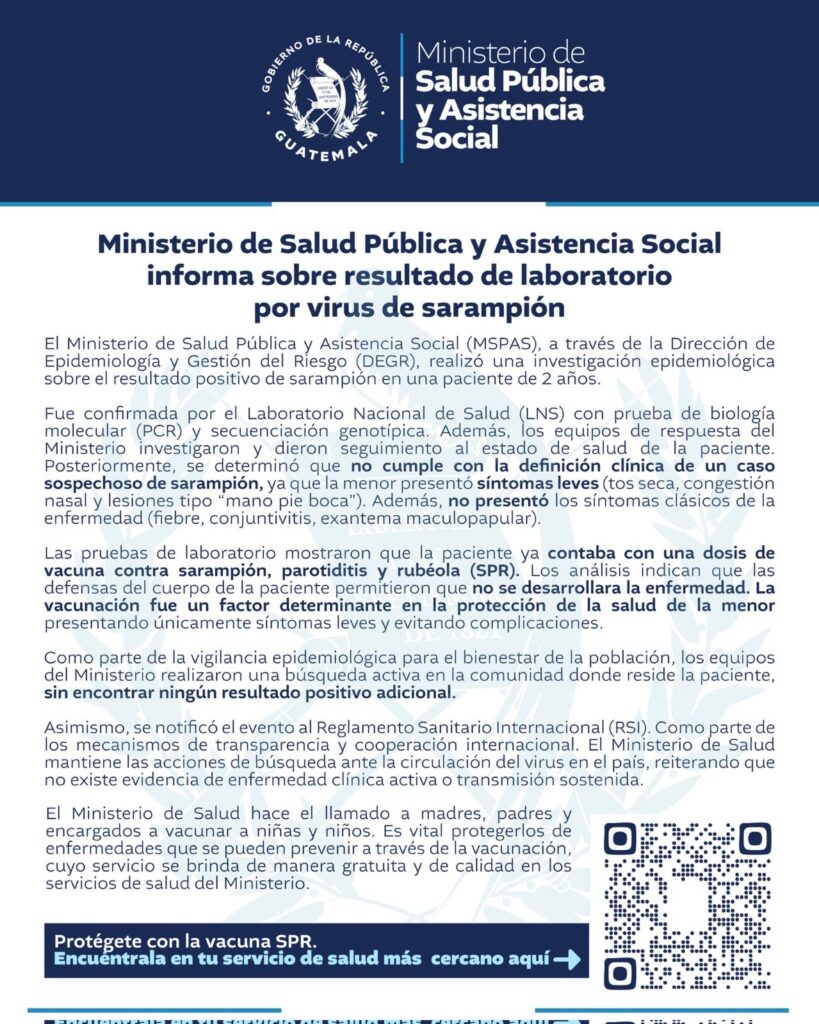 El Ministerio de Salud Pública y Asistencia Social (MSPAS) informó que una niña de 2 años dio resultado positivo al virus del sarampión, aunque no cumple con la definición clínica de un caso sospechoso, ya que únicamente presentó síntomas leves.