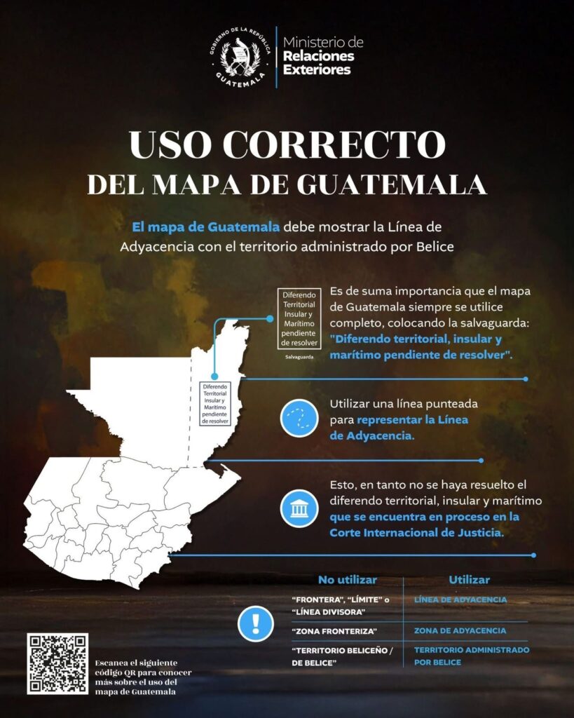 El mapa oficial de Guatemala debe reflejar el territorio administrado por Belice, representar la Línea de Adyacencia como una línea punteada y contar con una leyenda que indique «Diferendo territorial, insular y marítimo pendiente de resolver». Con esta medida, el Gobierno de Guatemala busca promover una comprensión adecuada del proceso y reafirma su compromiso con la difusión de información precisa y oportuna.»