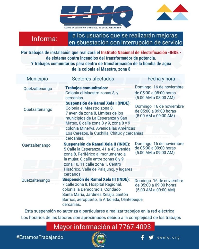 La Empresa Eléctrica Municipal de Quetzaltenango (EEMQ) informó sobre una nueva suspensión del servicio eléctrico programada para el próximo domingo, debido a trabajos solicitados por el Instituto Nacional de Electrificación (INDE).