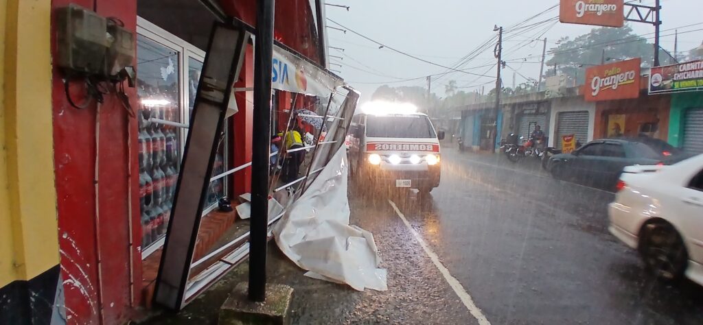 Las fuertes lluvias acompañadas de viento que se registraron esta tarde en Mercedes, sector La Galera, Coatepeque, provocaron la caída de un rótulo publicitario de una tienda, el cual impactó contra una persona que se encontraba en el lugar.