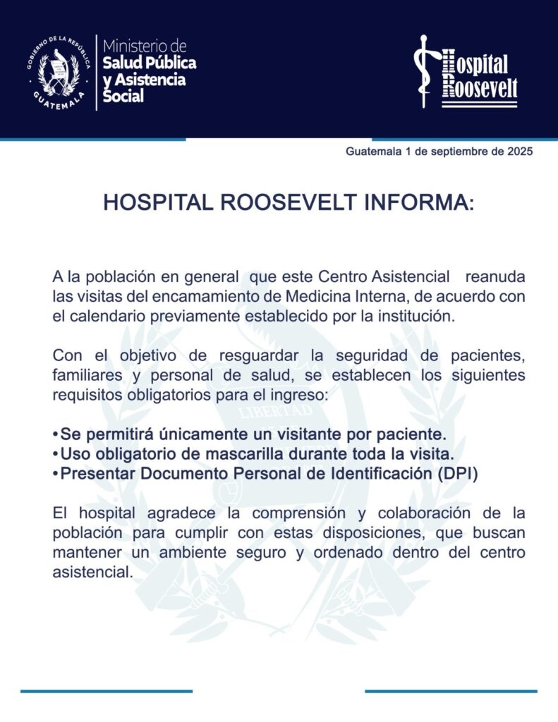 Hospital Roosevelt reanuda visitas en Medicina Interna. Las visitas vuelven a estar habilitadas luego de que se controlara el caso de tos ferina.