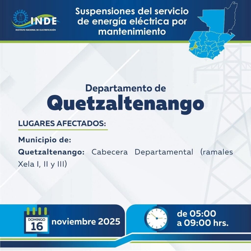 Estas labores, consideradas necesarias para fortalecer la seguridad operativa de la infraestructura eléctrica, están afectando temporalmente los ramales Xela 1, Xela 2 y Xela 3, lo que genera interrupciones del servicio en distintos sectores de la cabecera departamental.