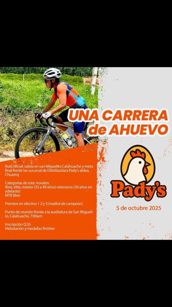 La competencia se realizará con salida desde la auxiliatura de San Miguelito, Calahuaché, a las 7:00 horas, y tendrá como meta la sucursal de Distribuidora Pady’s, en la aldea Chuatroj.
