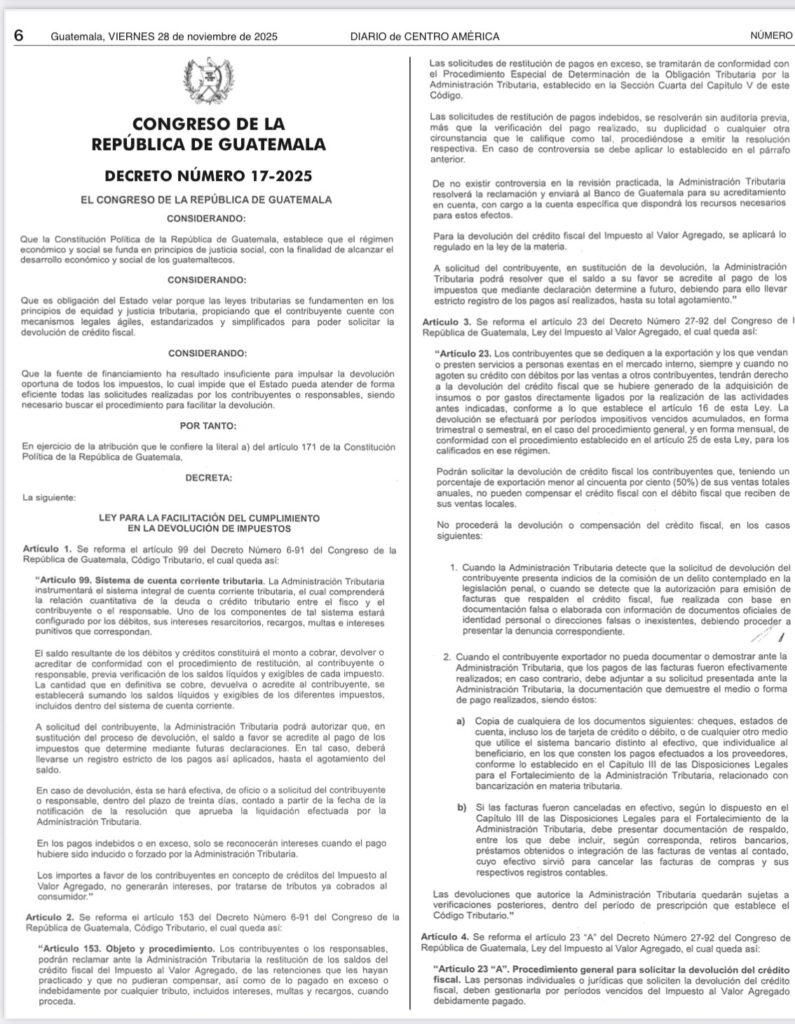 - Ley para la facilitación del cumplimiento en la devolución de impuestos : Se simplifican los procedimientos administrativos para agilizar la devolución de tributos a contribuyentes.