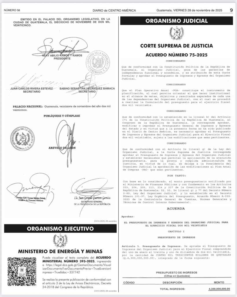 - Presupuesto 2026 del Organismo Judicial (OJ): Se presenta y oficializa la asignación presupuestaria correspondiente al próximo ejercicio fiscal del OJ.