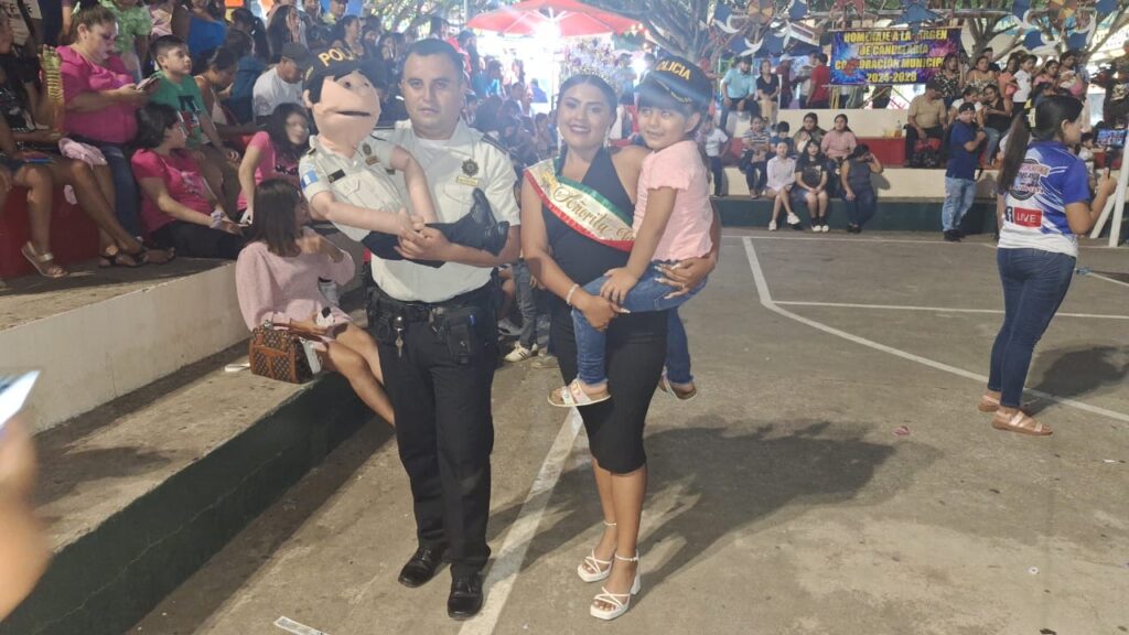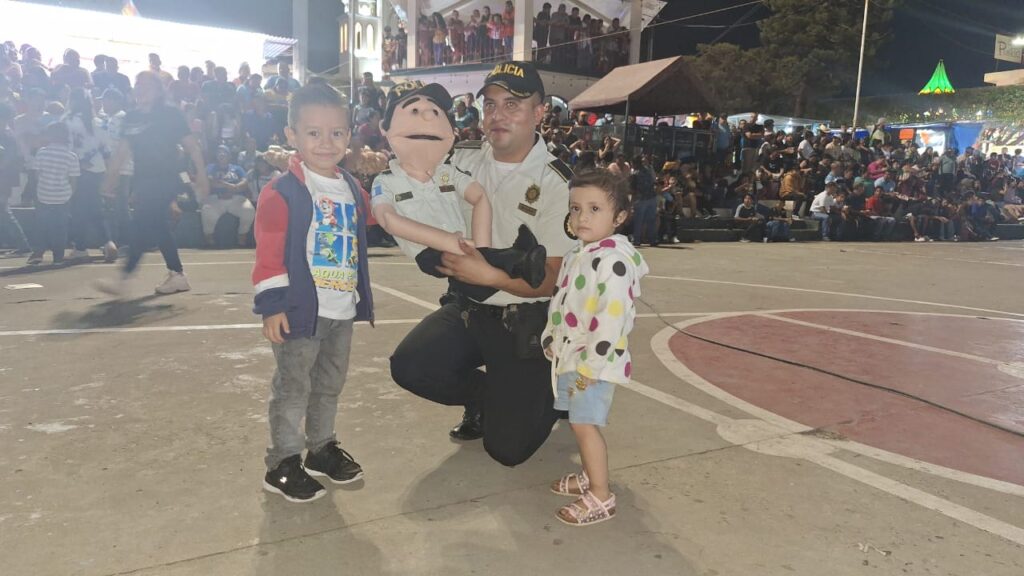 En el centro urbano de Flores Cosa Cuca, Quetzaltenango, por solicitud de la municipalidad de la localidad, se presenta por segunda ocasión el ventrílocuo «Lesh», de Prevención del Delito de la Policía Nacional Civil (PNC).