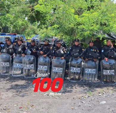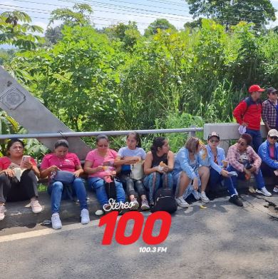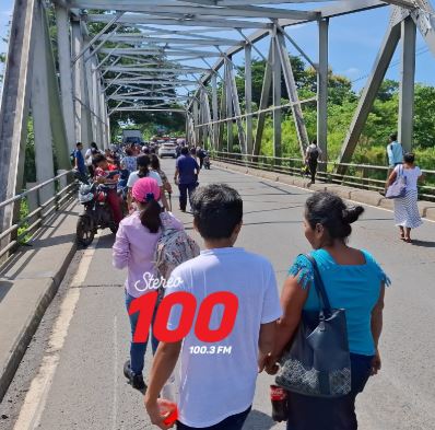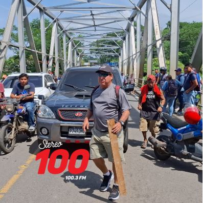 En el lugar hay presencia de agentes antimotines de la Policía Nacional Civil (PNC). Varias personas deben caminar para continuar con su viaje.