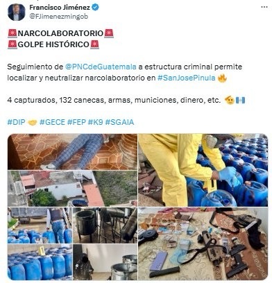 El titular del Ministerio de Gobernación, Francisco Jiménez, en sus redes sociales, resaltó la labor de la Policía Nacional Civil tras la localización y desmantelamiento de un narcolaboratorio en San José Pinula departamento de Guatemala.