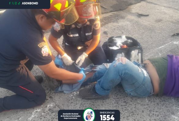 Los socorristas le brindan atención prehospitalaria a Esdras Castro, de 24 años, quien presenta posible fractura en la pierna derecha, golpes y erosiones.