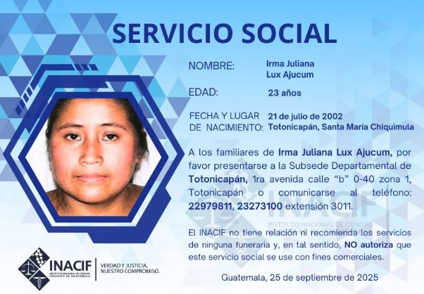 Este viernes se confirma que familiares han reclamado en el Instituto Nacional de Ciencias Forenses (Inacif) el cadáver de Irma Juliana Lux Ajucum, de 23 años.
