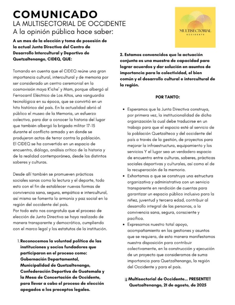 Este jueves, a un mes de la elección y toma de posesión de la Junta Directiva del Centro de Desarrollo Intercultural y Deportivo de Quetzaltenango (Cideq), la Multisectorial de Occidente emite comunicado.