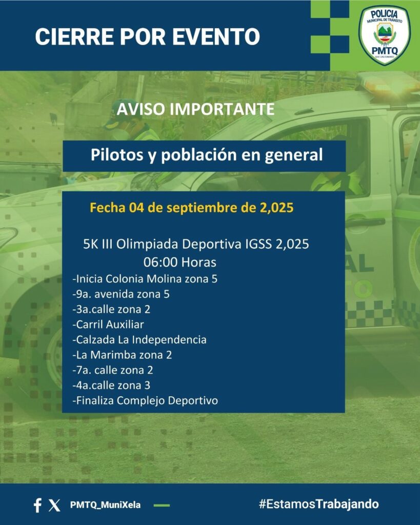 La vía alterna es calzada Manuel Lizandro Barillas, rotonda y 4ta calle, sin embargo se autorizó una carrera a las 6:00 de la mañana que sale del IGSS rumbo al Complejo Deportivo, esto impactará severamente en el tránsito.