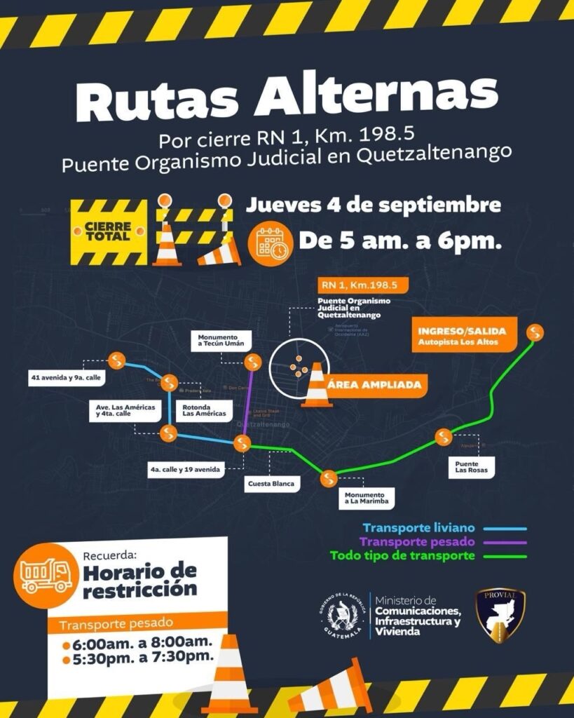 Hoy jueves 4 de septiembre se lleva a cabo el cierre total de la Ruta Nacional 1, kilómetro 198.5, sector del paso a desnivel de tribunales zona 6 de Xela.
