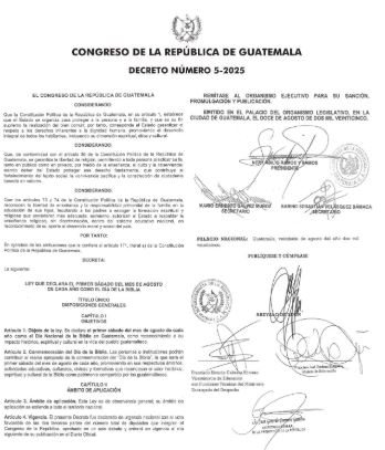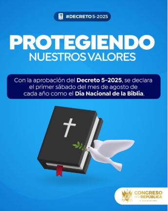 En el Decreto 5-25 oficializan que el primer sábado de agosto será conmemorado el Día de la Biblia.