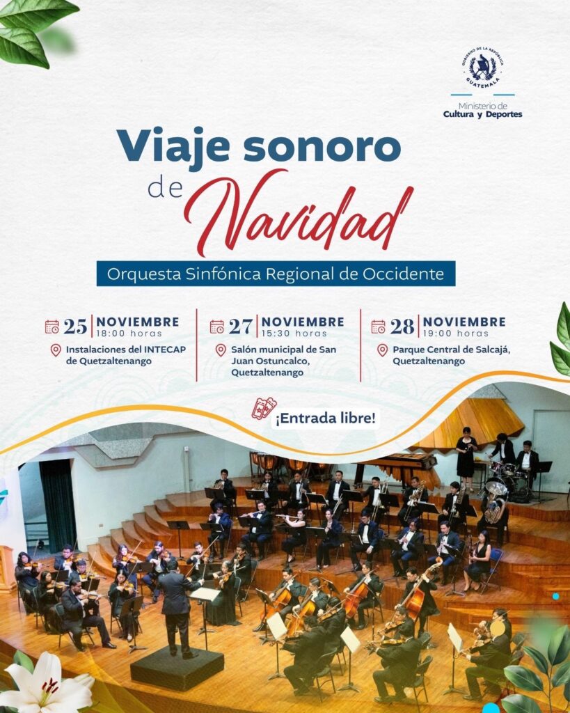El Ministerio de Cultura y Deportes anunció el inicio de una serie de presentaciones de la Orquesta Sinfónica Regional, que durante los próximos días ofrecerá conciertos gratuitos en distintos puntos de Quetzaltenango y algunos de sus municipios.