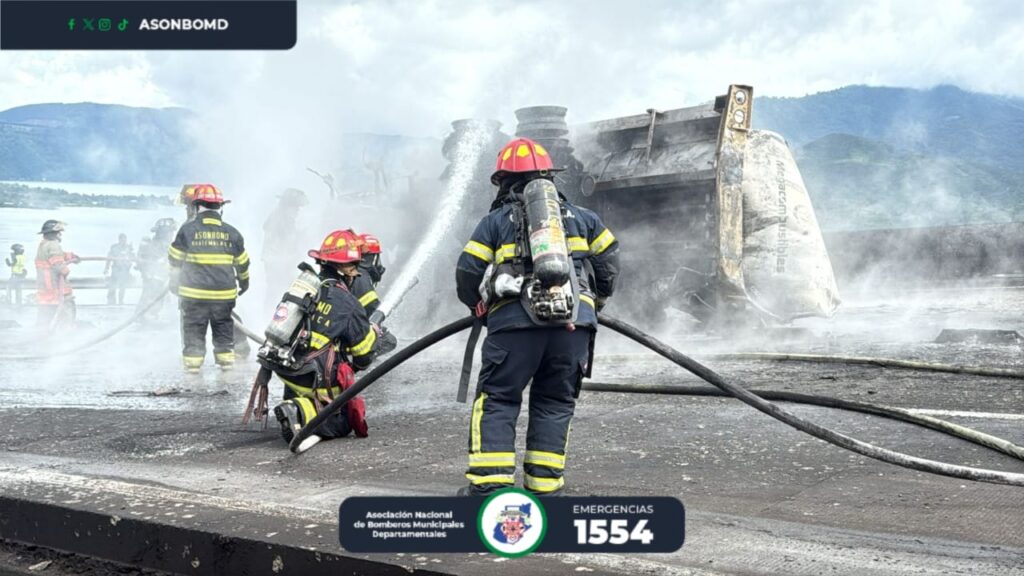 Bomberos Municipales Departamentales indican que desconocen qué provocó que el cisterna volcara y se incendiara.