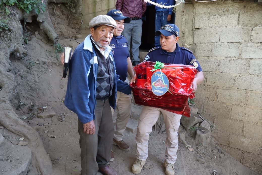 Los agentes hicieron entrega de una canasta navideña con productos de la canasta básica al señor Santiago Uz Gómez, de 82 años, conocido cariñosamente en la ciudad como “Don Santiaguito”, quien durante más de 65 años ha trabajado como lustrador de zapatos en el Parque Centro América, convirtiéndose en un personaje reconocido y apreciado por vecinos y visitantes.