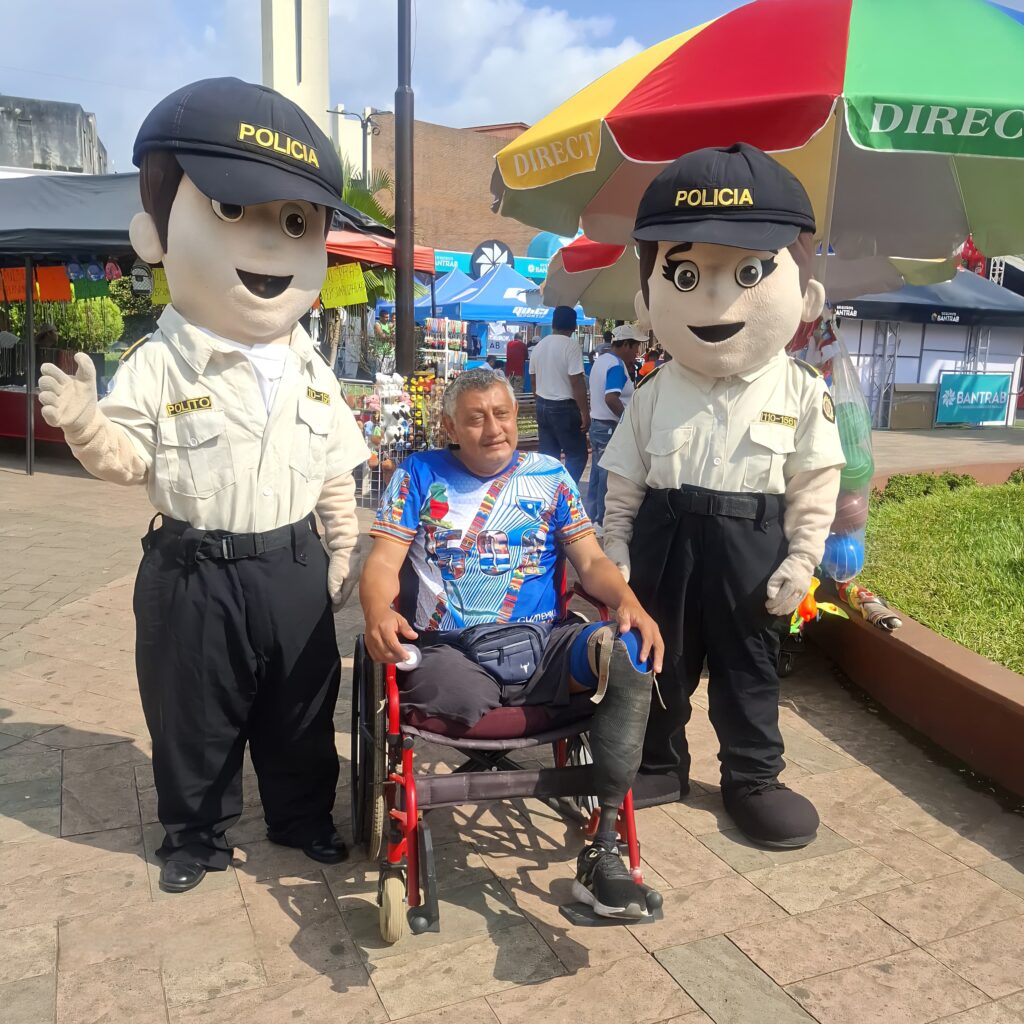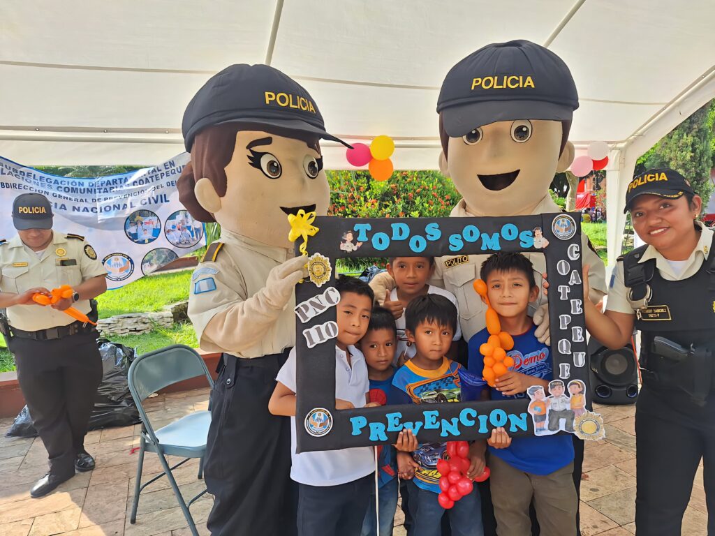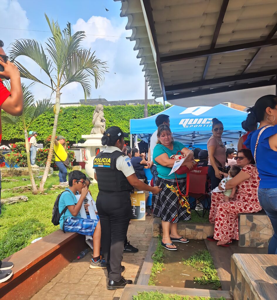 Este martes, agentes de la Subdirección General de Prevención del Delito de la Policía Nacional Civil (PNC) instalan un stand preventivo en el parque central de Coatepeque, Quetzaltenango.