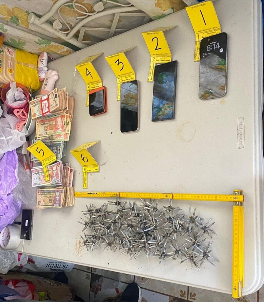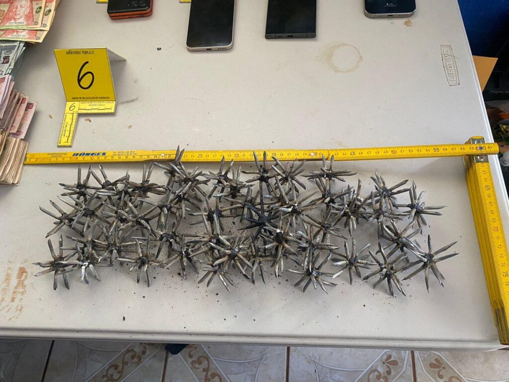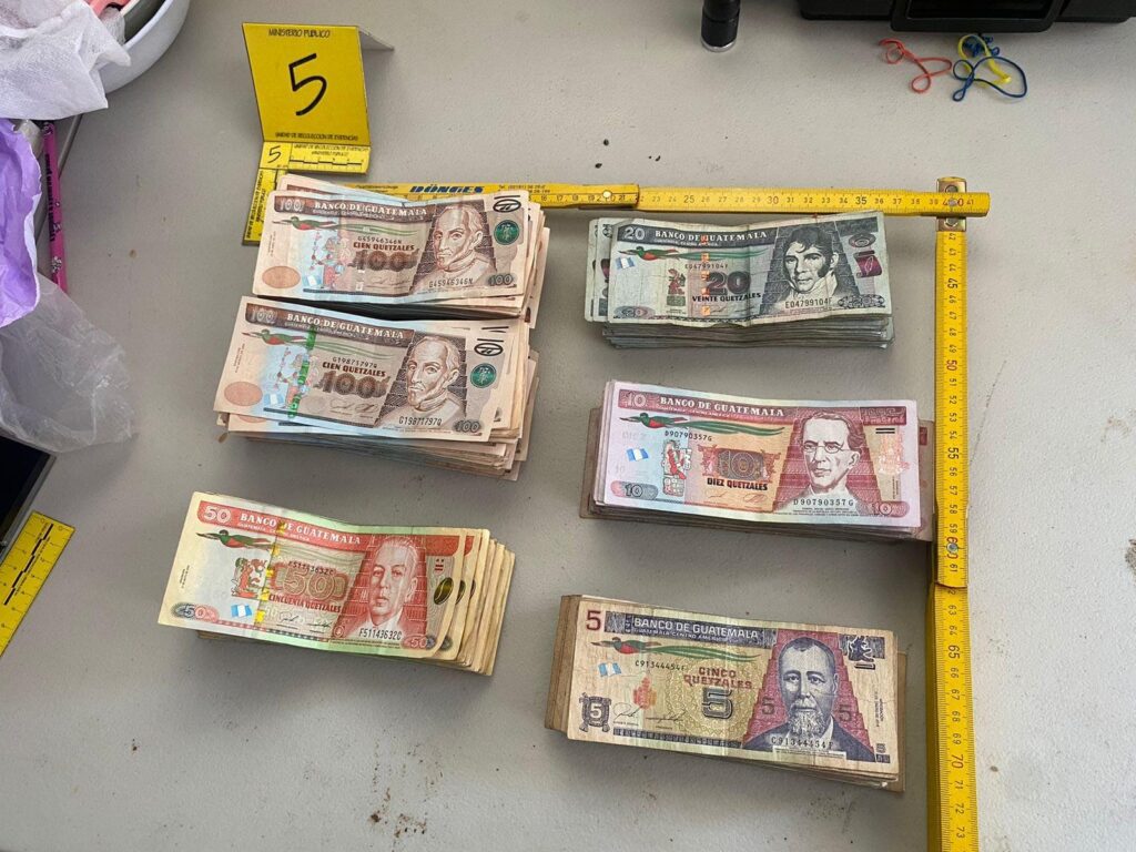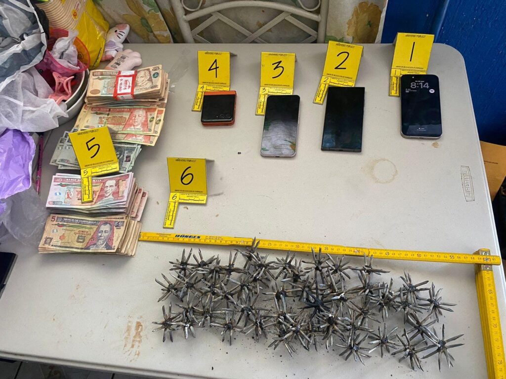 Durante el operativo se incautaron cuatro celulares que serán analizados para fortalecer la investigación, Q48 mil 875; 49 piezas metálicas con puntas, presuntamente utilizadas para pinchar las llantas de los camiones atacados por la banda.