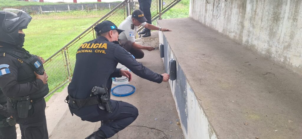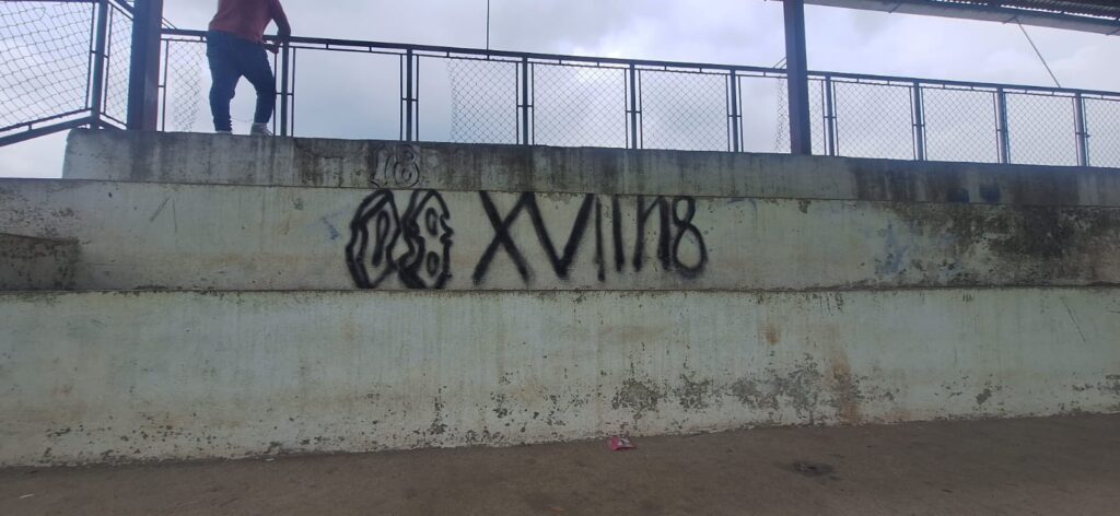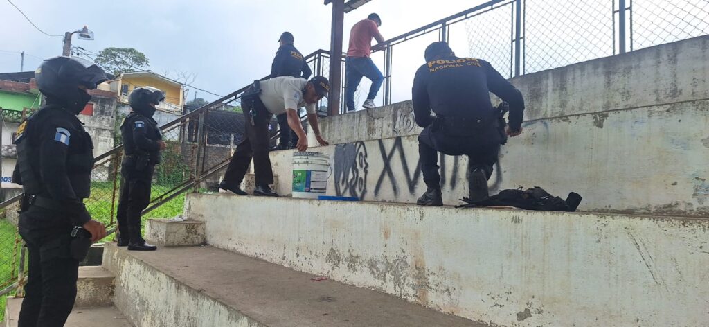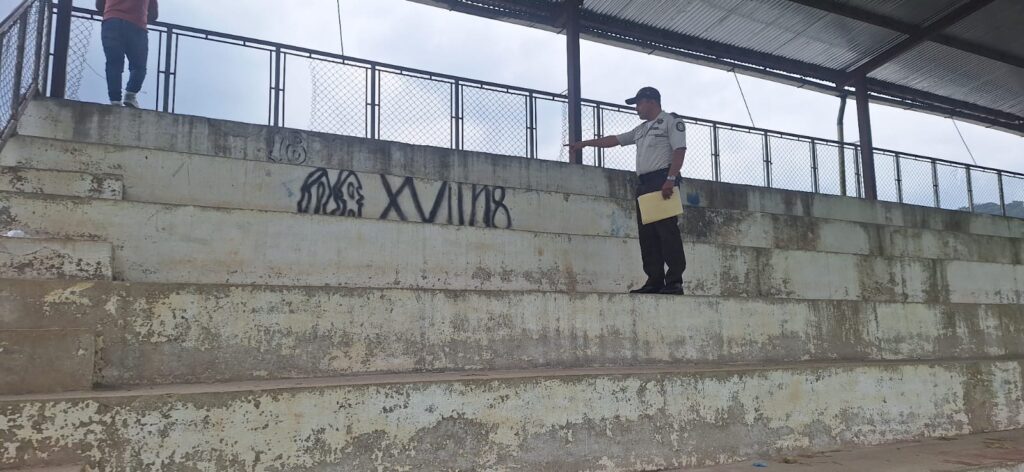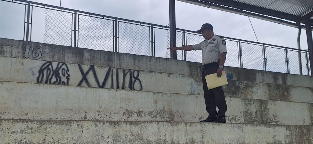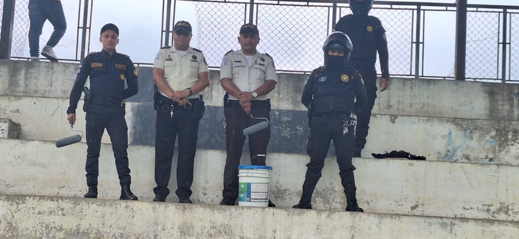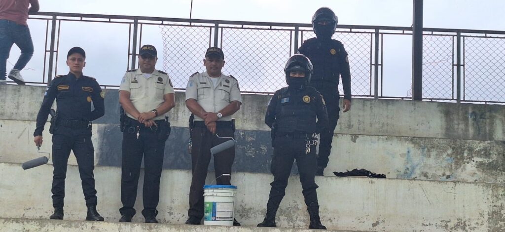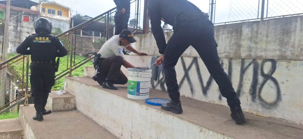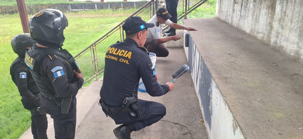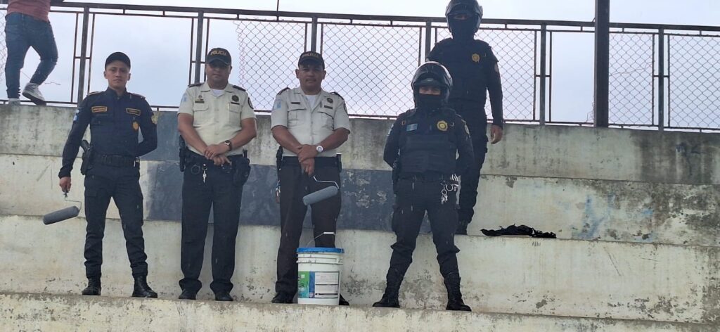 El jefe de la Subestación 41-55, inspector Ariel Ajanel, y agentes de dicha subestación recuperaron un área del graderío del campo de fútbol, el cual tenía grafitis y símbolos pertenecientes al grupo antisociales Mara 18.