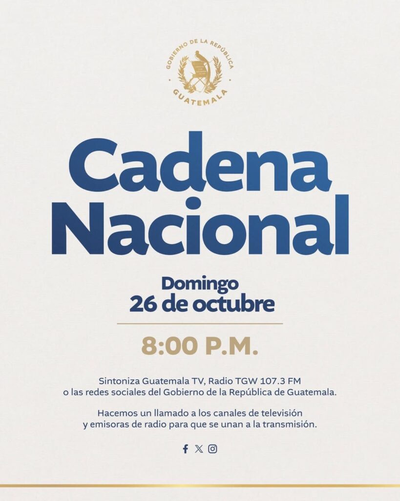 El presidente de la República, Bernardo Arévalo, anunció que se dirigirá a la nación mediante una cadena nacional programada para este domingo 26 de octubre a las 20:00 horas. “Convoco al pueblo de Guatemala a estar atentos al mensaje que dirigiré a la nación esta noche”, señaló el mandatario.