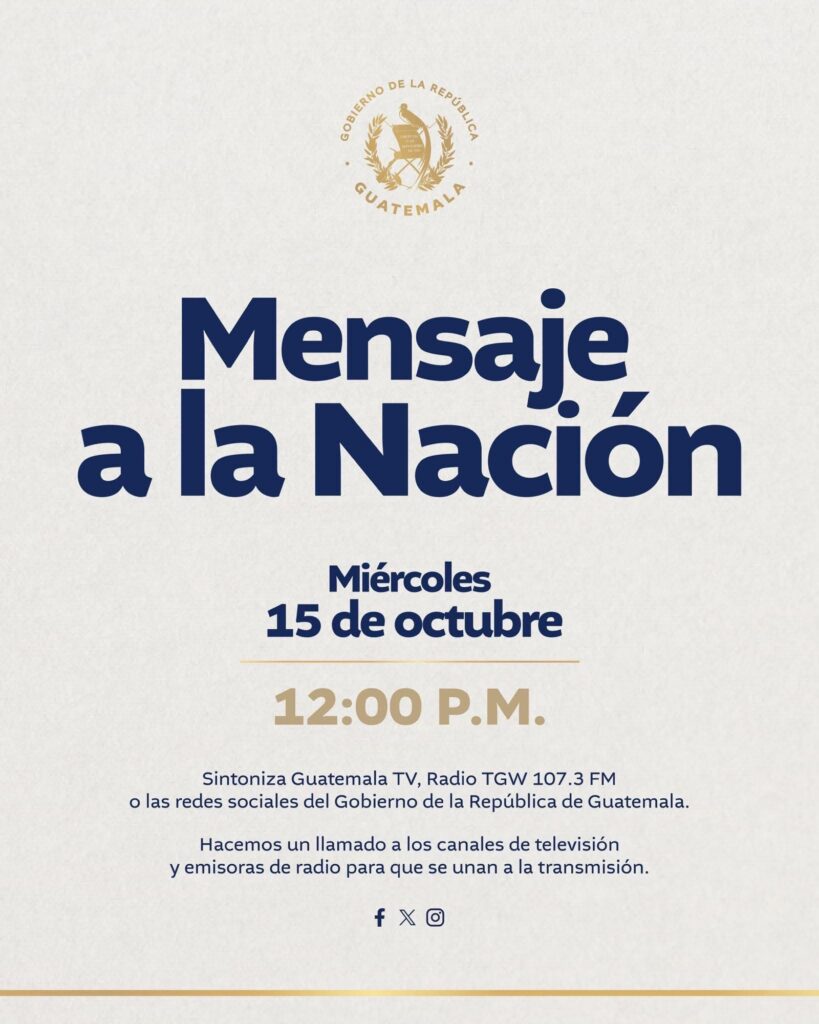 “He estado reunido con los equipos de seguridad y he tomado decisiones importantes. Mañana me dirigiré a la nación con un anuncio para responder a lo que importa: enfrentar al crimen y garantizar que las familias en Guatemala vivan seguras”, expresó el mandatario.